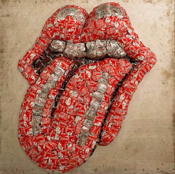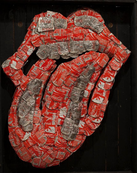 For Geronimo aka Jumping Bull, life has been a roller-coaster journey through places, lifestyles and identities. Mother Russian, father Sioux. From disaffected youth to one of the foremost rock artists of his generation. Friend of the famous. And now holding the first UK exhibition of his art at the Café Royal, London. Growing up on a North Dakota reservation, the country of his ancestors, he absorbed his father’s tribal culture – lessons learned and still remembered – until the modern world beckoned. Led by his own anger to a young offenders’ institution, where for the first time he awoke to the power not of his body but of his mind, and a thirst for knowledge began – “with no television, every day I read and learned”. New ventures followed, including a music studio and other businesses – not all of them legal – from which “money fell like rain and my only interest was in spending it”. However, too many rules broken, and prison called him back … more than once. Behind bars, Geronimo escaped through painting. Salvation through shape, line … and colour, though he sees only in black and white, the legacy of a fight that left him blind for three months. Self-taught, as with much in his life, he has also learnt from other artists. Mixing materials and styles, searching for his own ‘voice’ in paint, not just to create the perfect likeness, but looking to bring out what’s inside him and to capture it on canvas – “My paintings are part of me”. One of his favorite painters, Francis Bacon, known for bold, raw emotional images, would have approved. Art is now who Geronimo is and what he does – “Business is not what I’m about any more. Back then I was just a shell with nothing inside”. Among his fans is musician Keith Richards – “the soul of the Rolling Stones” – met by chance on tour, portrait done, the start of a lasting friendship with him and the band – “though I grew up with disco, not rock”. Now the Stones are not only part of his life, but also the inspiration for his art – paintings, portraits and sculptures – with their legendary ‘tongue’ logo made from flattened Coke cans becoming one of his most recognized and celebrated pieces.