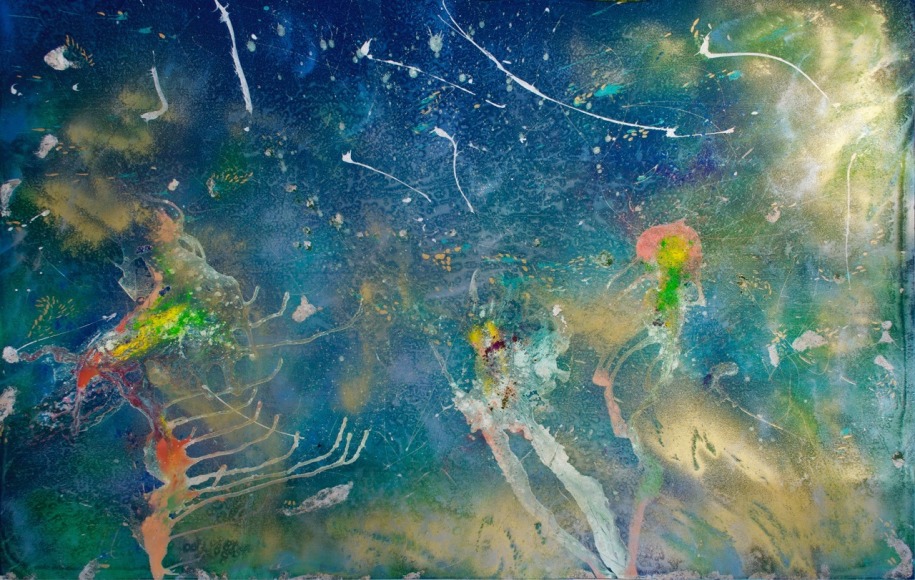 new aquatic mystical series involving natural mixed media such as raw silver dust and