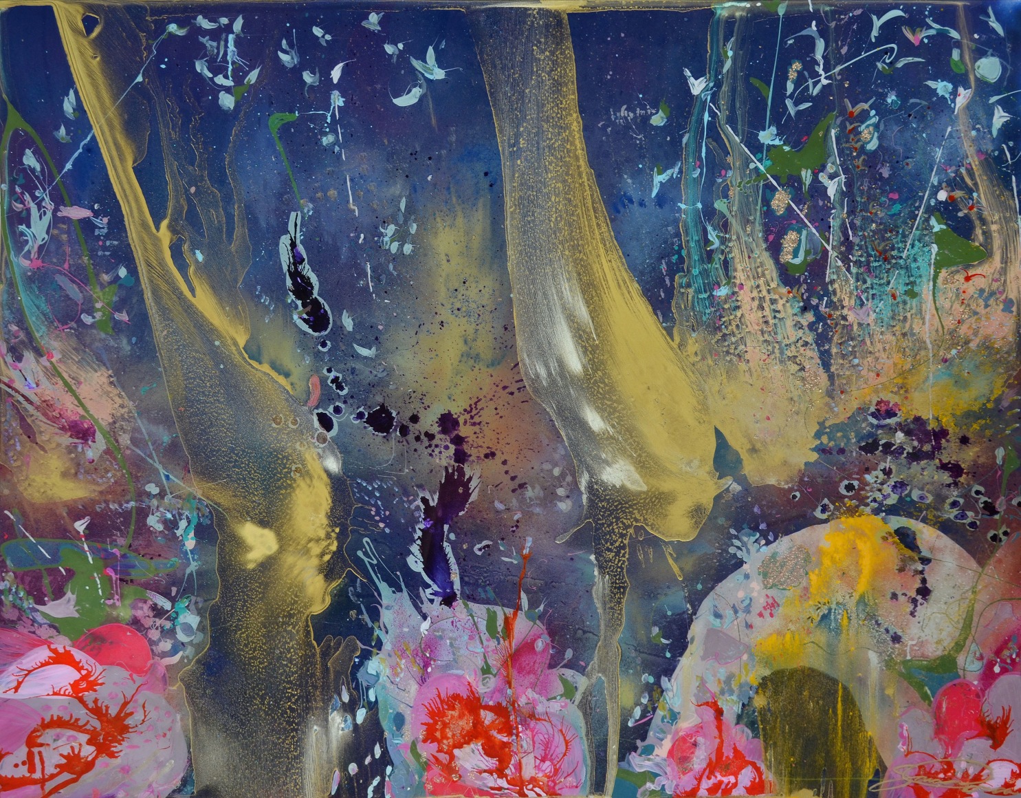 18k gold leafing, raw pigments colors, mica flakes and natural crystals.